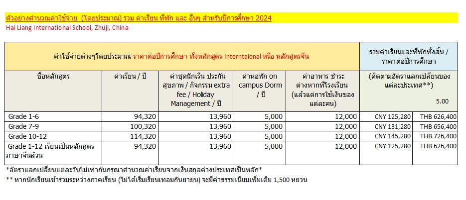 4. หากนักเรียนเข้าร่วมระหว่างภาคเรียน (ไม่ได้เริ่มเรียนในเทอมกันยายน) จะมีค่าธรรมเนียมเพิ่มเติม 1,500 หยวน